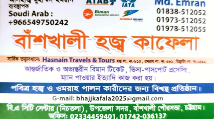 মোহাম্মদ আমিনুল ইসলাম চট্টগ্রাম বাঁশখালী প্রতিনিধি আলহামদুলিল্লাহ, মহান আল্লাহ তাআলার অশেষ রহমতে বাঁশখালী হজ্জ্ব কাফেলার ব্যবস্থাপক আলহাজ্ব মোহাম্মদ ইমরান এর বড় কন্যা পবিত্র কুরআনে হিফজ সম্পূর্ণ করেছেন। তিনি বাঁশখালী মদীনাতুল read more