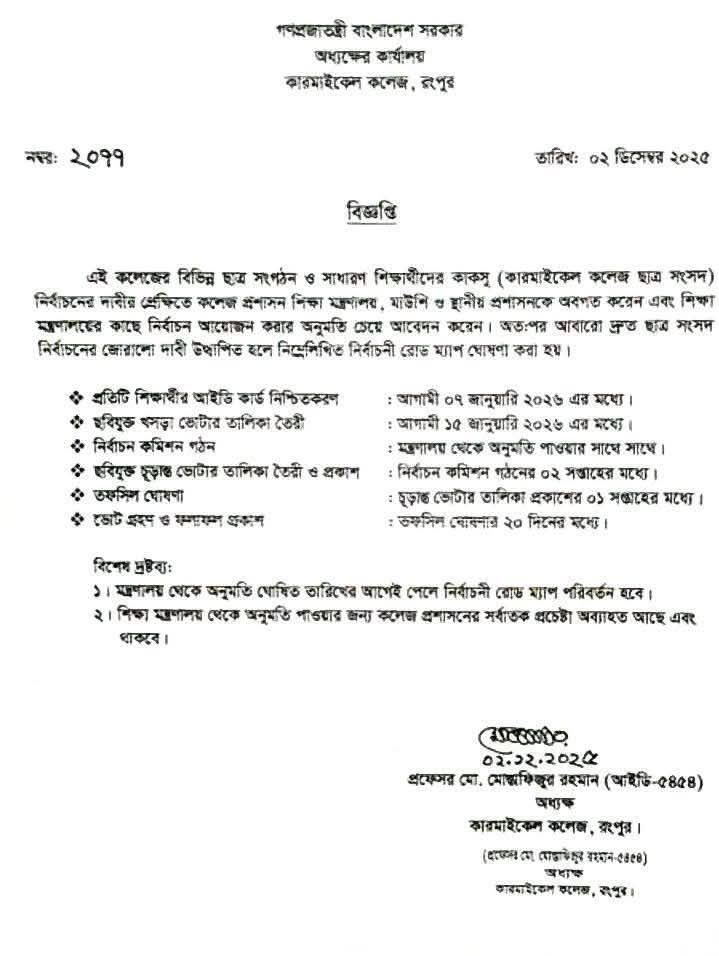 দীর্ঘ ৩৫ বছর পর অবশেষে রংপুর কারমাইকেল কলেজে ছাত্র সংসদ (কাকসু) নির্বাচনের রোডম্যাপ ঘোষণা করেছে কলেজ প্রশাসন। গতকাল মঙ্গলবার (০২ ডিসেম্বর) অধ্যক্ষ অধ্যাপক মো. মোস্তাফিজুর রহমানের স্বাক্ষরিত এক বিজ্ঞপ্তিতে এই নির্বাচনের তফসিল ঘোষণা করা হয়।