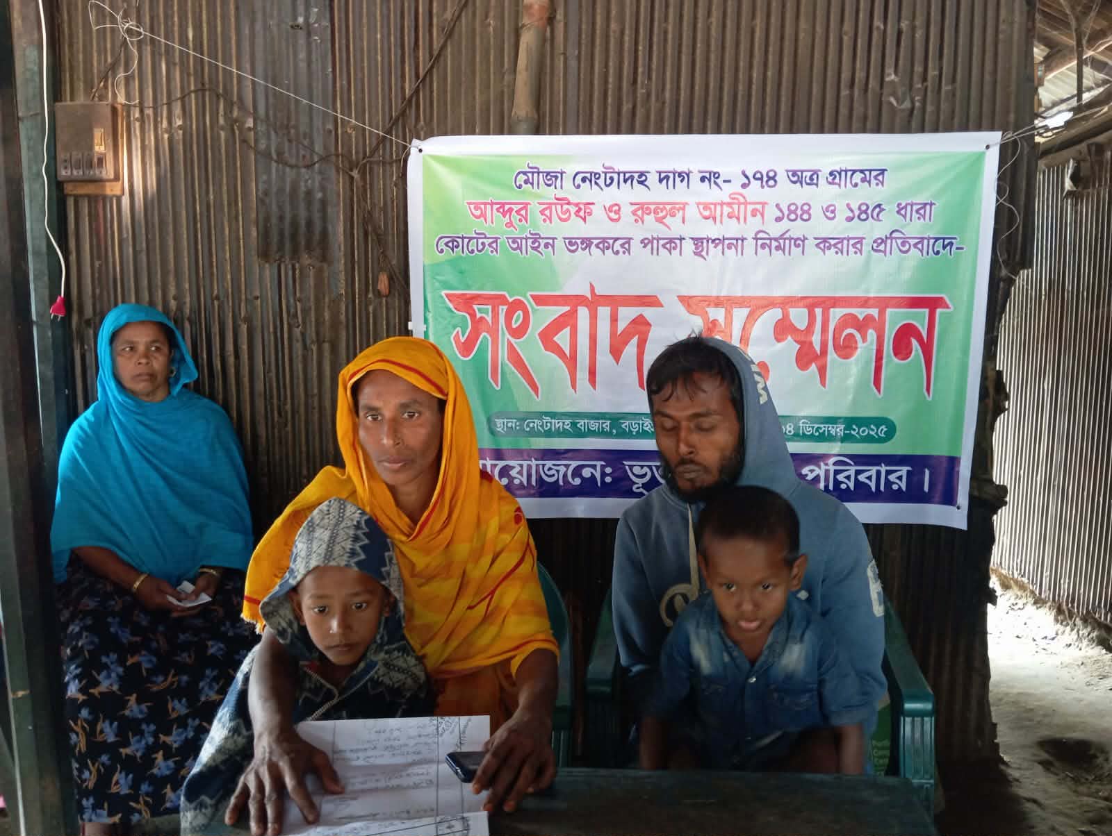বৃহস্পতিবার নেংটাদহ বাজারে আয়োজিত সংবাদ সম্মেলনে প্রতিবন্ধীর স্ত্রী হোসনেয়ারা ও স্থানীয়রা জানান, প্রায় দশ বছর আগে নেংটাদহ মৌজার আরএস ১৭৪ নং দাগে রব্বেল আল-আমিন তিন শতাংশ জমি ক্রয় করে একটি টিনসেড দোকানঘর তৈরি করেন। হঠাৎ প্রতিপক্ষগণ দোকানঘরটি ভেঙে দিয়ে ইটের পাকা ঘর নির্মাণ শুরু করলে হোসনেয়ারা আদালতে হাজির হয়ে দোকানঘর ভাঙা ও জমিতে জোরপূর্বক ঘর নির্মাণ শুরুর অভিযোগ আনেন।