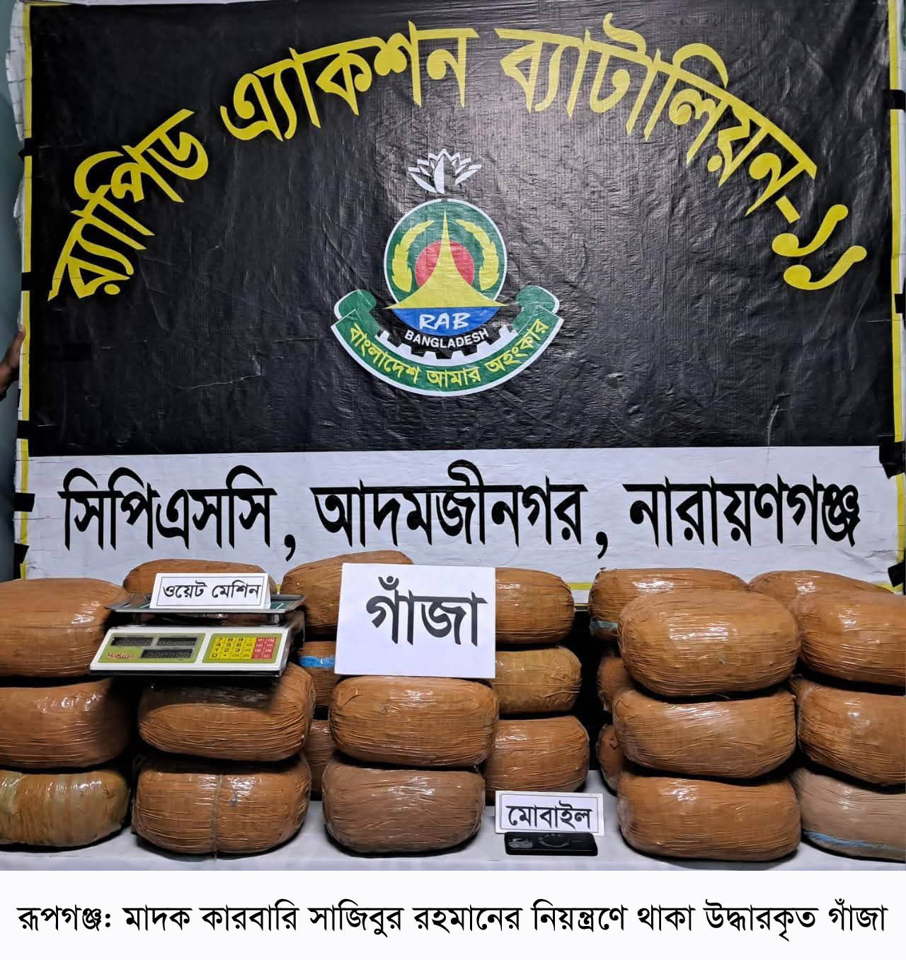 নারায়ণগঞ্জের রূপগঞ্জ উপজেলার কায়েতপাড়া ইউনিয়নের বড়ালু পাড়াগাঁও এলাকা থেকে সাড়ে ৭০কেজি গাঁজাসহ সাজিবুর রহমান(৬১) নামের এক মাদক কারবারিকে আটক করা হয়েছে। । গত ৩ডিসেম্বর বুধবার রাতে র্যাব-১১ এর সদস্যরা বড়ালু পাড়াগাঁও থেকে তাকে আটক করে। তিনি বড়ালু পাড়াগাঁও গ্রামের রহমতউল্লাহ আড়তদারের ছেলে।
