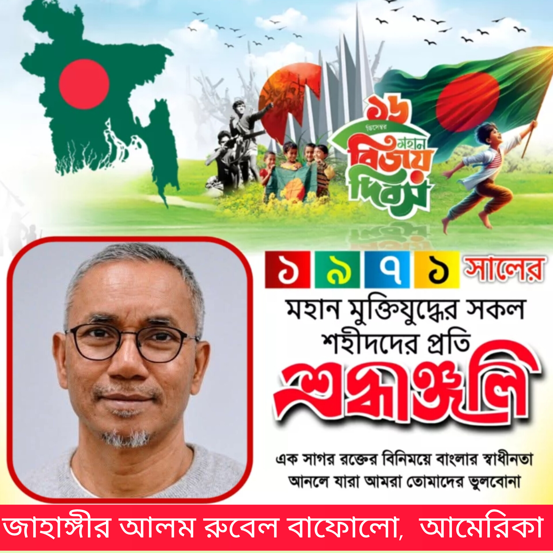 ১৯৭১ সালের এই দিনে দীর্ঘ নয় মাস রক্তক্ষয়ী সংগ্রামের পর বাঙালি জাতি পরাধীনতার গ্লানি মুছে ফেলে চূড়ান্ত বিজয় অর্জন করেছিল। ৩০ লক্ষ শহীদের আত্মত্যাগ এবং ২ লক্ষ মা-বোনের সম্ভ্রমের বিনিময়ে অর্জিত এই স্বাধীনতা আমাদের অহংকার। এই দিনে আমি গভীর শ্রদ্ধার সাথে স্মরণ করছি জাতির শ্রেষ্ঠ সন্তানদের যাদের আহ্বানে উদ্বুদ্ধ হয়ে বাঙালি জাতি মুক্তিযুদ্ধে ঝাঁপিয়ে পড়েছিল।