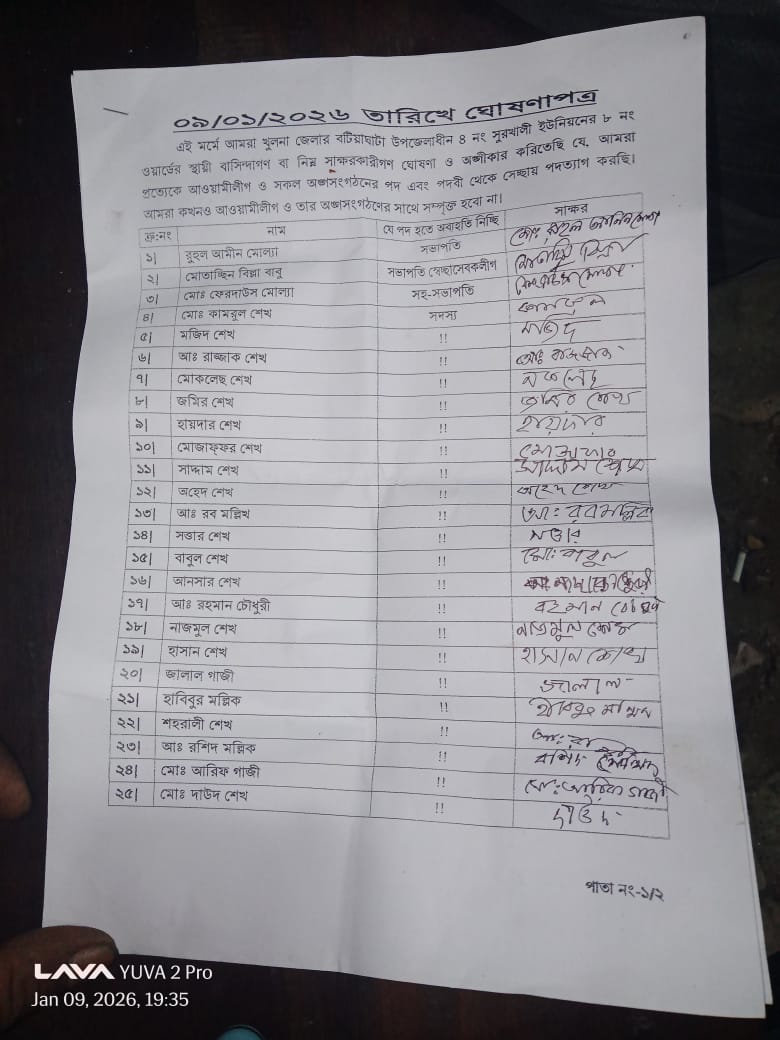 খুলনা বটিয়াঘাটা উপজেলার ৪ নং সুরখালীর ৮নং ওয়ার্ড থেকে আওয়ামীলীগের শতাধিক নেতাকর্মী শ্বেচ্ছায় পদত্যাগ করেন।গত ০৯ জানুয়ারী শুক্রবার এক লিখিত ঘোষণাপত্রের মাধ্যমে নিম্ন লিখিত সদস্য গন তাদের সকল পদ পদবী থেকে পদত্যাগ করেন এবং তারা কখনো আওয়ামীলীগ ও তার অঙ্গসংগঠণের সাথে সম্পৃক্ত হবে না। সদস্যরা হলেন,