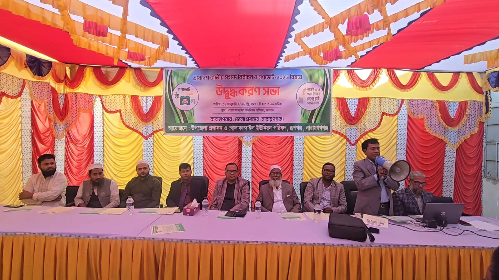 দেশের চাবি আপনার হাতে এই স্লোগানকে সামনে রেখে নারায়ণগঞ্জের রূপগঞ্জের গোলাকান্দাইল ইউনিয়ন পরিষদ প্রাঙ্গনে আগামী ত্রয়োদশ জাতীয় সংসদ নির্বাচন এবং আসন্ন গণভোট উপলক্ষে বিশেষ প্রচারণামূলক ও সচেতনতামূলক সভা অনুষ্ঠিত হয়েছে। আজ সকালে গোলাকান্দাইল ইউনিয়ন পরিষদের আয়োজনে এসভা অনুষ্ঠিত হয়।