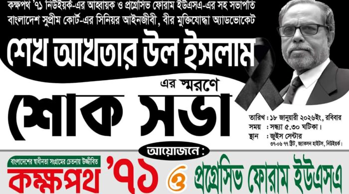 গক রবিবার,১৮ জানুয়ারী ২০২৬নিউইয়র্কের জ্যাকসন হাইটসে এর জুইস সেন্টারে সন্ধ্যা ৭টায় কক্ষপথ”৭১ নিউইয়ক ও প্রগ্রেসিভ ফোরাম ইউএসএ এর উদ্যোগে বীর মুক্তিযোদ্ধা অ্যাডভোকেট শেখ আকতার উল ইসলাম এর স্মরণে শোক সভা অনুষ্ঠিত হয়। উক্ত শোক সভায় সভাপতিত্ব করেন প্রগ্রেসিভ ফোরামের সাবেক সভাপতি বীর মুক্তিযোব্ধা খোরশেদ উল ইসলাম ও সঞ্চালনা করেন কক্ষপথ”৭১ নিউইয়কের যুগ্ম আহ্বায়ক অ্যাডভোকেট মিয়া এইচ জাকির। সভার শুরুতে প্রয়াত অ্যাডভোকেট শেখ আকতার উল ইসলামের সন্মানে ১ মিনিট নিরবতা পালন করা হয়। স্বাগত বক্তব্য প্রদান করেন প্রগ্রেসিভ ফোরাম ইউএসএ এর সাধারন সম্পাদক জাকির হোসেন বাচ্চু ও কক্ষপথ-৭১ নিউইয়ক এর সদস্য সচিব অ্যাডভোকেট জয়জিত আচার্য্য। শোক সভায় বীর মুক্তিযোব্ধা,আইনজীবী,সাংবাদিক,ও বিভিন্ন সংগঠনের নেতৃবৃন্দ উপস্থিত ছিলেন। শোক সভায় অতিথি হিসাবে বীর মুক্তিযোব্ধা ইসমাইল আনসারী, বাংলাদেশ ল’সোসাইটি ইউএসএ এর সভাপতি বীর মুক্তিযোব্ধা অ্যাডভোকেট এম.মতিউর রহমান,সিনিয়র সাংবাদিক ও কক্ষপথ-৭১ নিউইয়কের উপদেষ্টা হাকিকুল ইসলাম খোকন,বাংলাদেশ ল’সোসাইটি ইউএসএ সাবেক সভাপতি অ্যাডভোকেট মোহাম্মদ আলী বাবুল, মিঠুন আহমেদ,বাংলাদেশ ল’সোসাইটি ইউএসএ সাবেক সাধারন সম্পাদক অ্যাডভোকেট সাইয়েদ মঈন উদ্দিন জুনেল, উদীচীর সাধারন সম্পাদক কল্লোল দাস, মহিলা পরিষদের সাধারন সম্পাদক সুলেখা পাল, বাংলাদেশ ল’সোসাইটি ইউএসএ সাবেক যুগ্ম সাধারন সম্পাদক অ্যাডভোকেট মোহাম্মদ সাইদুর রহমান, প্রগ্রেসিভ ফোরামের যুগ্ম সম্পাদক আলিম উদ্দিন,ডা: আজিজুল হক,ভিক্ট্রর এলাহী লিয়াকত,ড.ওবায়েদ উল্ল্যাহ মামুন,কালফুম খন্দগীর,এম.এ করিম জাহাঙ্গীর, প্রয়াত শেখ আখতার উল ইসলাম এর ছোট ভাই শেখ আতিকুল ইসলাম, আল আমিন বাবু, সাংবাদিক উত্তম কুমার সাহাপ্রমুখ। শোক সভায় অনান্যদের মধ্যে উপস্থিত ছিলেন বাংলাদেশ ল’সোসাইটি ইউএসএ কোষাধ্যক্ষ অ্যাডভোকেট মাহবুব আলম,মুনমুন সাহা,সাংবাদিক সোহেল চৌধুরী ও মুজহারুল ইসলাম চৌধুরী মুছা । বক্তারা তাহাদের বক্তব্যে প্রয়াত অ্যাডভোকেট শেখ আকতার উল ইসলামের বিভিন্ন স্মৃতির প্রতি শ্রব্ধা ও তার সাংগঠনিক কর্মকান্ডের জন্য তিনি সকলের নিকট অক্ষয় হয়ে থাকবেন,জাতীরএই বীর মুক্তিযোব্ধা ও সিনিয়র আইনজীবী হিসাবে দেশ ও সমাজের জন্য অনেক অবদান চীর স্মরণীয় হয়ে থাকবেন। শোক সভায় প্রয়াত শেখ আকতার উল ইসলামের জন্য দোয়া পরিচালনা করেন ইমাম কাইয়ুম।