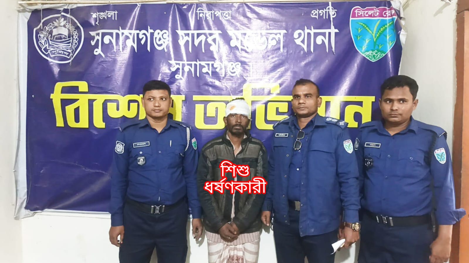 সুনামগঞ্জ সদর উপজেলার মহনপুর ইউনিয়নের তাজ নগর গ্রামে ২য় শ্রেনীর এক স্কুল ছাত্রী ৭ বছরের শিশু ধর্ষণের শিকার হয়েছে। পাষন্ড ঘাতককে আটক করে কারাগারে প্রেরণ করা হয়েছে। ঘটনাটি ঘটে ২৯ জানুয়ারী ২০২৬ ইং তারিখ রোজ বৃহস্পতিবার বিকেলে। বর্তমানে মুমূর্ষ অবস্থায় সুনামগঞ্জ সদর হাসপাতালে চিকিৎসাধীন রয়েছে ৭ বছরের ঐ শিশু মেয়ে ফৌজিয়া । সে মোহনপুর ইউনিয়নের জয়নগর বাজার আইডিয়াল কিন্ডার গার্টেন স্কুলে নার্সারী-২তে পড়ে। প্রত্যক্ষদোষী ও পুলিশ সূত্রে জানা যায় বৃহস্পতিবার বিকেল ৩টার দিকে ইউনিয়নের তাজনগর গ্রামে ৭ বছরের শিশু মেয়ে ফৌজিয়া তার ৫ বছর বয়সী ছোট ভাই বাইজিতকে নিয়ে পাশের বাড়ির উঠানে খেলতে যায়। এসময় পাশের বাড়ির পাষন্ড জিয়াউর রহমান (৪০),মেয়েটির মুখ চেপে ধরে ঘরের ভিতরে নিয়ে যায় এবং ঘরের দরজা বন্ধ করে দেয়। এসময় ভাই বাইজিত দৌড়ে এসে নিজ বাড়িতে তার মায়ের কাছে বলে ফৌজিয়াকে পাশের বাড়ির জিয়াউর রহমান মুখে চেপে ধরে ঘরের ভিতরে নিয়ে গেছে। বাইজিতের কথা শুনে আশপাশের লোকদের নিয়ে মেয়েটির স্বজনেরা পাষন্ড জিয়াউর রহমানের ঘরের দরজায় ডাকতে থাকেন। পরে দরজা ভেঙে ভিতরে প্রবেশ করে এলাকাবাসী ৭ বছরের শিশু মেয়েটিকে মুখ বাঁধা অবস্থায় পড়নের জামা কাপর ছাড়া অসচেতন অবস্থায় উদ্ধার করেন এবং ধর্ষণকারী জিয়াউর রহমানকে হাতে নাতে আটক করে সদর থানা পুলিশকে খবর দেন এলাকাবাসী। ঘটনার খবর পেয়ে সদর থানা পুলিশ ঘটনাস্থলে গিয়ে ধর্ষণকারী জিয়াউর রহমানকে আটক করে। নির্যাতনের শিকার শিশু মেয়েটিকে সদর থানার অফিসার ইনচার্জ মোঃ রতন সেখ (পিপিএম)' এর তত্বাবধানে সুনামগঞ্জ জেলা সদর হাসপাতালে চিকিৎসার জন্য মুমূর্ষ অবস্থায় ভর্তি করা হয়। বর্তমানে মেয়েটি পুলিশের তত্বাবধানে চিকিৎসাধীন অবস্থায় রয়েছে। এ ঘটনায় মেয়ের চাচা মোঃ আলী আহমদ বাদী হয়ে সদর থানায় একটি ধর্ষণ মামলা করেছেন যার মামলা নং-৫০,তারিখ ২৯/১/২০২৬ইং, ধারা - নারী ও শিশু নির্যাতন দমন আইন_( ২০০০ সনের-৯ এর (১) ধারা। এব্যাপারে সদর মডেল থানার অফিসার ইনচার্জ মোঃ রতন সেখ (পিপিএম) ঘটনার সত্যতা নিশ্চিত করে জানান। নির্যাতনের শিকার শিশুটি অনেক আহত হয়েছে পুলিশের তত্বাবধানে শিশুটিকে প্রাথমিক চিকিৎসার ব্যবস্থা করা হয়েছে, ঘাতক ধর্ষণকারী আসামীকে আটক করে আদালতে প্রেরণ করা হয়েছে, আশা করি অপরাধী আদালতের মাধ্যমে দৃষ্টান্তমূলক শাস্তি পাবে। এই নেক্কার জনক ঘটনার জন্য আমরা হতভঙ্গ হয়েছি, কি করে একটি শিশুর সাথে এমন নির্মম নির্যাতন কাজ করা হয়েছে। শিশুটি বর্তমানে চিকিৎসাধীন রয়েছে। পুলিশের কার্যক্রম অব্যাহত আছে।###