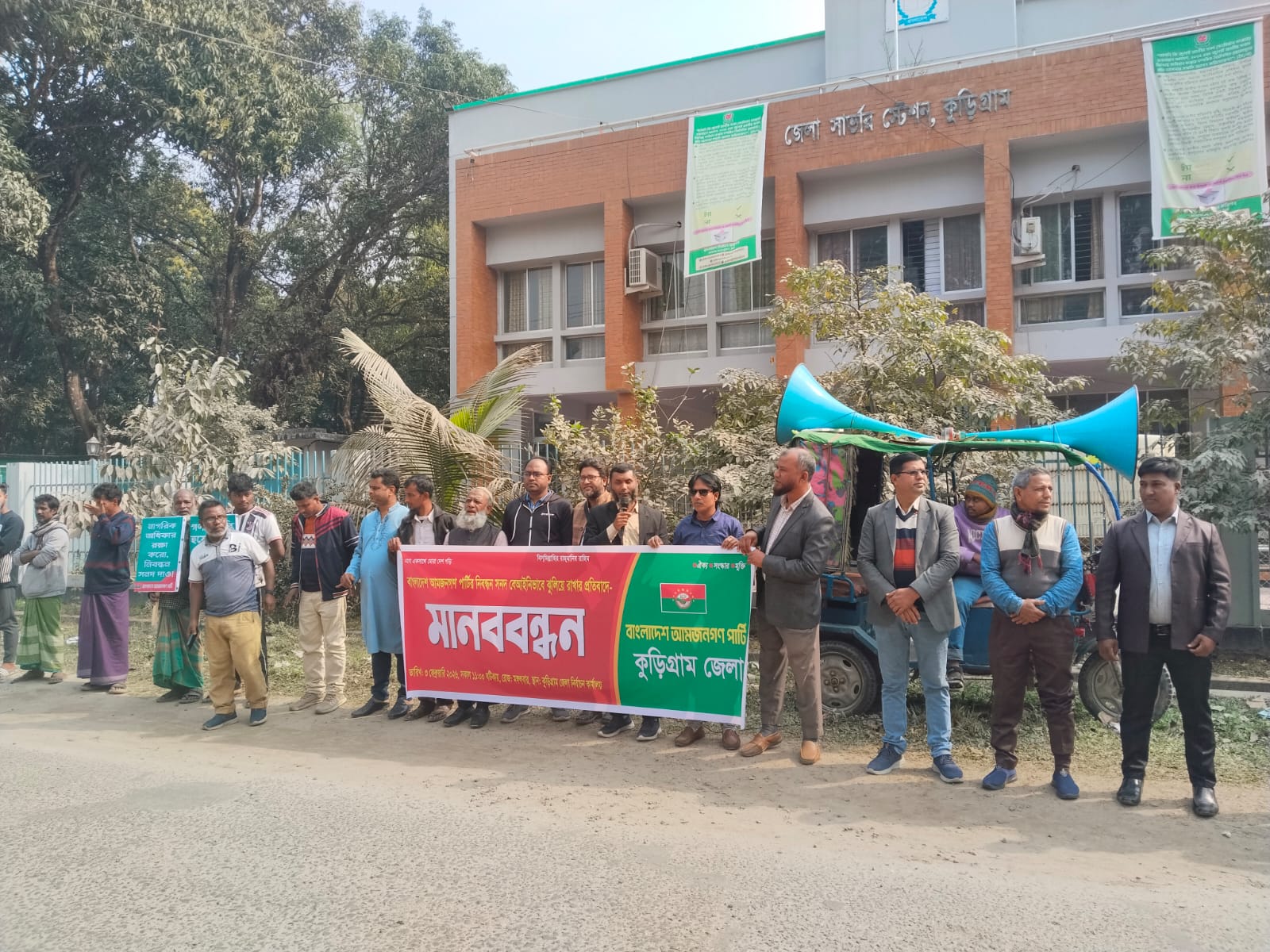বাংলাদেশ নির্বাচন কমিশনের সংস্কার এবং বাংলাদেশ আমজনগণ পার্টির নিবন্ধন প্রদানসহ ৫ দফা সংস্কার দাবিতে কুড়িগ্রামে শান্তিপূর্ণ মানববন্ধন কর্মসূচি অনুষ্ঠিত হয়েছে।