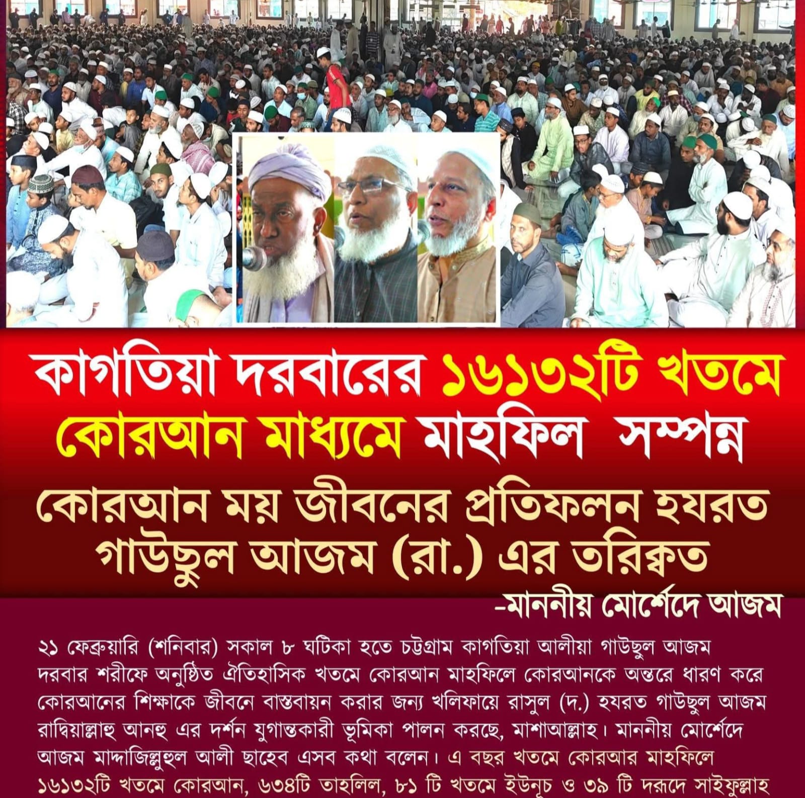 ২১ ফেব্রুয়ারি (শনিবার) সকাল ৮ ঘটিকা হতে চট্টগ্রাম কাগতিয়া আলীয়া গাউছুল আজম দরবার শরীফে অনুষ্ঠিত ঐতিহাসিক খতমে কোরআন মাহফিলে মাননীয় মোর্শেদে আজম মাদ্দাজিল্লুহুল আলী ছাহেব এসব কথা বলেন।