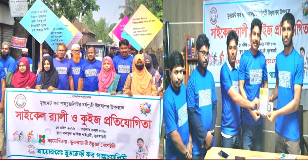 ভুরুঙ্গামারী কুড়িগ্রাম প্রতিনিধিঃ কুড়িগ্রামের ভুরুঙ্গামারীতে মুভমেন্ট ফর পাংকচুয়ালিটির বর্ষপূর্তি উদযাপন উপলক্ষে সাইকেল র্যালি ও কুইজ প্রতিযোগিতা অনুষ্ঠিত হয়েছে।