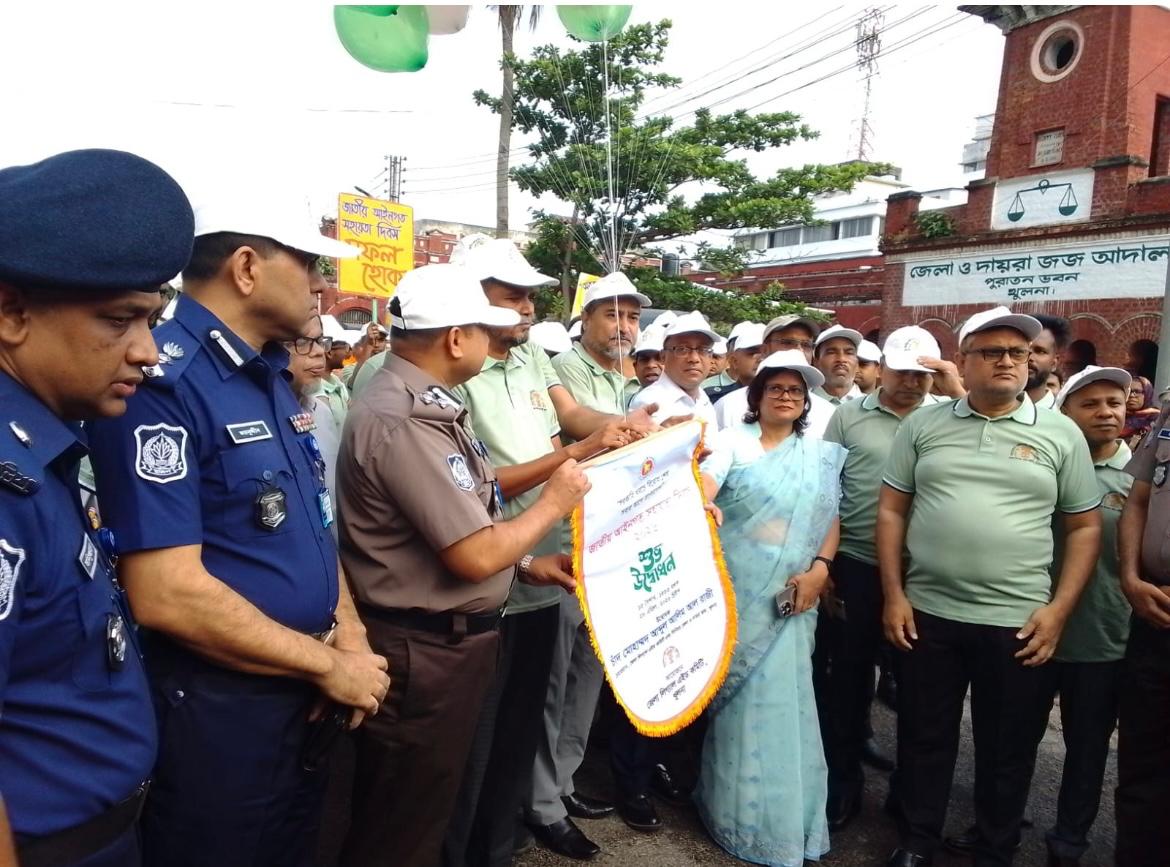 “সরকারি খরচে বিরোধ শেষ, সবার আগে বাংলাদেশে”—এই প্রতিপাদ্যকে সামনে রেখে খুলনায় যথাযোগ্য মর্যাদা ও বর্ণাঢ্য আয়োজনের মধ্য দিয়ে জাতীয় আইনগত সহায়তা দিবস উদযাপন করা হয়েছে। মঙ্গলবার সকালে জেলা লিগ্যাল এইড কমিটি, খুলনার উদ্যোগে জেলা আইনজীবী সমিতির মিলনায়তনে আলোচনা সভা এবং আদালত চত্বরে বর্ণাঢ্য র্যালির আয়োজন করা হয়। অনুষ্ঠানের শুরুতে পবিত্র কোরআন থেকে তিলাওয়াত করেন আব্দুল কাইয়ুম এবং পবিত্র গীতা পাঠ করেন প্রশান্ত ঋষি। অনুষ্ঠানটি সঞ্চালনা করেন খুলনার বিজ্ঞ যুগ্ম জেলা ও দায়রা জজ ইয়াসমিন নাহার। আলোচনা সভায় সভাপতির বক্তব্যে বিজ্ঞ সিনিয়র জেলা ও দায়রা জজ এবং জেলা লিগ্যাল এইড কমিটির চেয়ারম্যান চাঁদ মোহাম্মদ আব্দুল আলিম আল রাজী বলেন, “আইনগত সহায়তা পাওয়া কেবল করুণা নয়, বরং এটি প্রতিটি নাগরিকের সাংবিধানিক অধিকার। অর্থের অভাবে কেউ যেন বিচার থেকে বঞ্চিত না হয়, তা নিশ্চিত করতে আমরা বদ্ধপরিকর।” অনুষ্ঠানে বিশেষ অতিথি হিসেবে উপস্থিত ছিলেন খুলনা রেঞ্জ ডিআইজি মোঃ রেজাউল হক, বিভাগীয় কমিশনার মোঃ আবদুল্লাহ হারুন, পুলিশ কমিশনার মোহাম্মদ জাহিদুল হাসান , জেলা প্রশাসক ও জেলা ম্যাজিস্ট্রেট হুরে জান্নাত, এবং পুলিশ সুপার মোহাম্মদ তাজুল ইসলাম ।